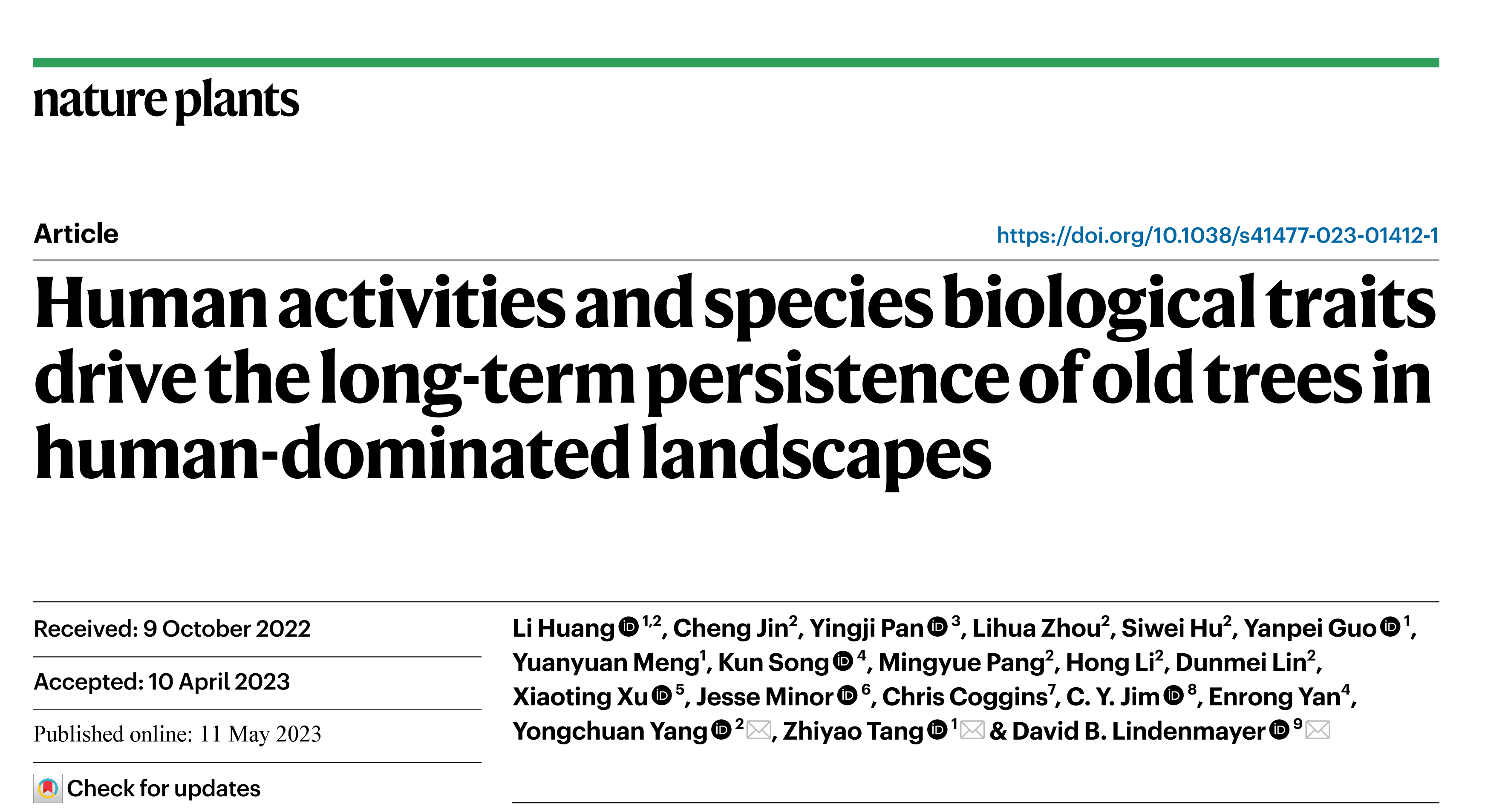 Nature Plants∣唐志尧教授团队和合作者揭示影响人类聚居区古树长期留存的关键因素